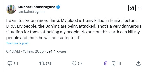 Il a justifié cette menace par sa volonté de protéger « son peuple » tué à Bunia. « Mon sang est tué à Bunia, dans l’est de la RDC. Mon peuple, les Bahima (Bahema, Ndlr) est attaqué. C’est une situation très dangereuse pour ceux qui attaquent mon peuple. Personne sur cette terre ne peut tuer mon peuple et penser qu’il ne va pas en subir les conséquences », a-t-il écrit.