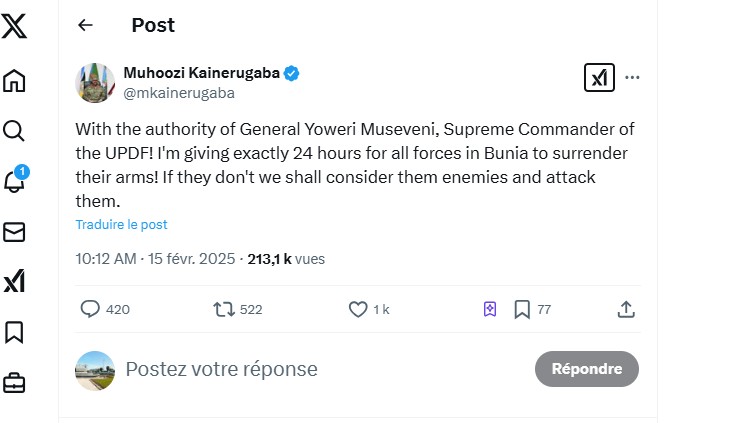 Alors que les armées de la République démocratique du Congo (FARDC) et de l’Ouganda (UPDF) travaillent conjointement dans le cadre des opérations Shujaa lancées depuis 2021 contre les terroristes ADF dans une partie de la province du Nord-Kivu et une partie de l’Ituri, le général Kainerugaba a mentionné, dans un post sur son X (ex-Twitter) supprimé au lendemain de sa publication, que cet ultimatum a été donné « sur ordre du général Yoweri Museveni, commandant suprême de l’UPDF ».