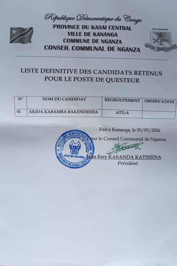 Le Conseil communal de Nganza a rendu publique, ce mardi 3 février 2026, la liste officielle des candidats retenus au poste de Questeur, à l’issue d’un examen approfondi des dossiers de candidature.Après analyse et délibération, un seul candidat a été admis à poursuivre le processus.