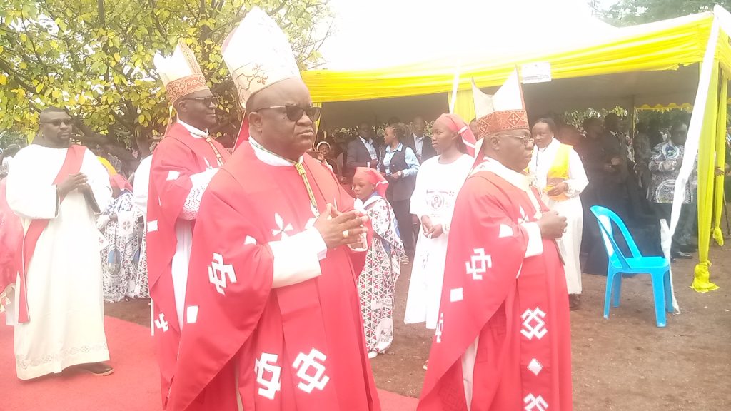 Evêques catholiques en pleine procession à l'ouverture de la messe de translation du corps du bienheureux Floribert Bwanachui Bin Kositi. Sanctuaire d'Adoration, Goma. © Etienne M.