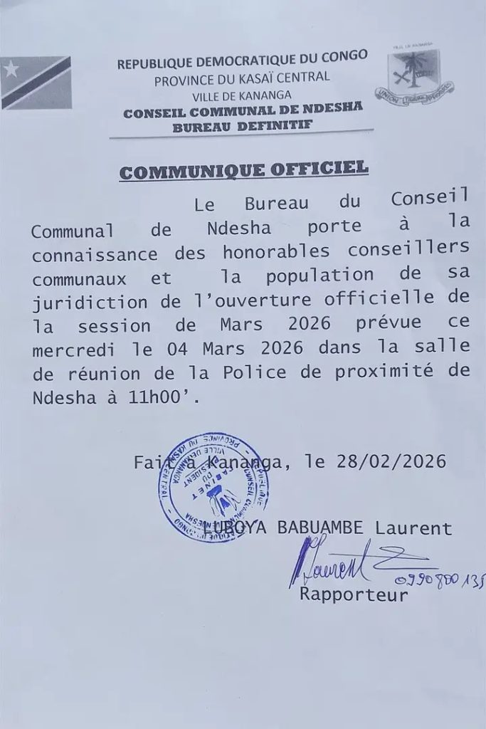 Selon un communiqué rendu public le 28 février 2026 et signé par le rapporteur du Conseil communal, Laurent Luboya Babuambe, cette session s’ouvrira le mercredi 4 mars 2026 à 11 heures, dans la salle de réunion de la Police de proximité de Ndesha, située à Kananga, chef-lieu de la province du Kasaï Central.