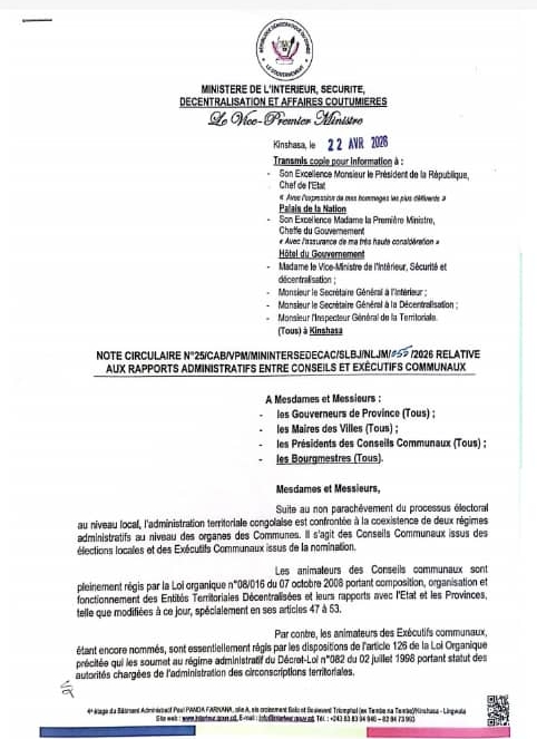 À travers cette initiative, le ministère de l’Intérieur et de la Sécurité entend consolider la décentralisation en RDC, en favorisant une gestion locale plus inclusive, plus transparente et plus performante. Les autorités concernées sont appelées à appliquer rigoureusement ces directives, considérées comme essentielles au bon fonctionnement des entités territoriales décentralisées.